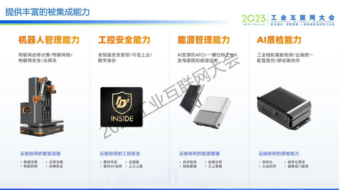 平臺面向單個設(shè)備、單條產(chǎn)線、多工廠多基地三個場景,提供設(shè)備級物聯(lián)運維、產(chǎn)線級生產(chǎn)監(jiān)控、多工廠多基地的制造協(xié)同平臺等標(biāo)準(zhǔn)產(chǎn)品服務(wù),同時提供云邊協(xié)同的機(jī)器人管理能力、工控安全能力、能源管理能力、AI質(zhì)檢能力等,讓用戶按需選擇靈活集成到自有系統(tǒng)中。