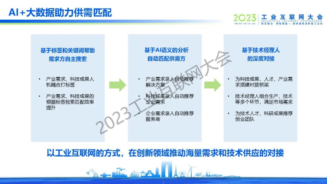 “AI+大數據助力供需匹配,通過基于標簽和關鍵詞幫助需求方自主搜索、基于AI語義的分析自動匹配供需方和基于技術經理人的深度對接三個方式,在創新領域推動海量需求和技術供應的對接。“