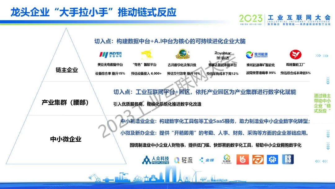 金暉指出,龍頭企業構建數據中臺+A.I中臺為核心的可持續進化企業大腦,產業集群通過工業互聯網平臺+園區,依托產業園區為產業集群進行數字化賦能,中小制造業企業可構建數字化工具包等工業SaaS服務,助力企業數字化轉型。