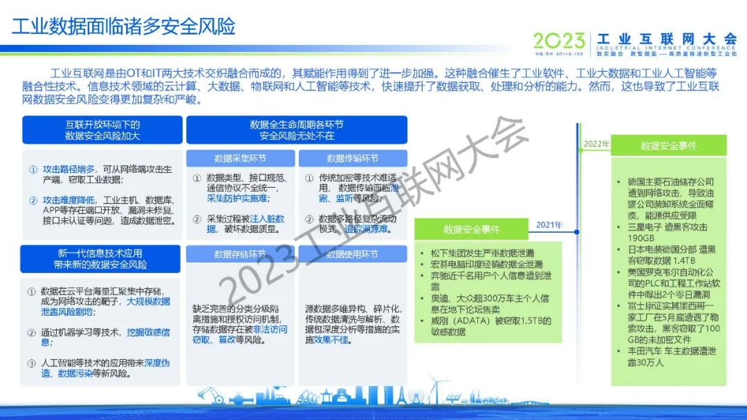 王亭景介紹,工業(yè)互聯(lián)網(wǎng)是由OT和IT兩大技術交織融合而成的,其賦能作用得到了進一步加強。這種融合催生了工業(yè)軟件、工業(yè)大數(shù)據(jù)和工業(yè)人工智能等融合性技術。信息技術領域的云計算、大數(shù)據(jù)、物聯(lián)網(wǎng)和人工智能等技術,快速提升了數(shù)據(jù)獲取、處理和分析的能力。然而,這也導致了工業(yè)互聯(lián)網(wǎng)數(shù)據(jù)安全風險變得更加復雜和嚴峻。