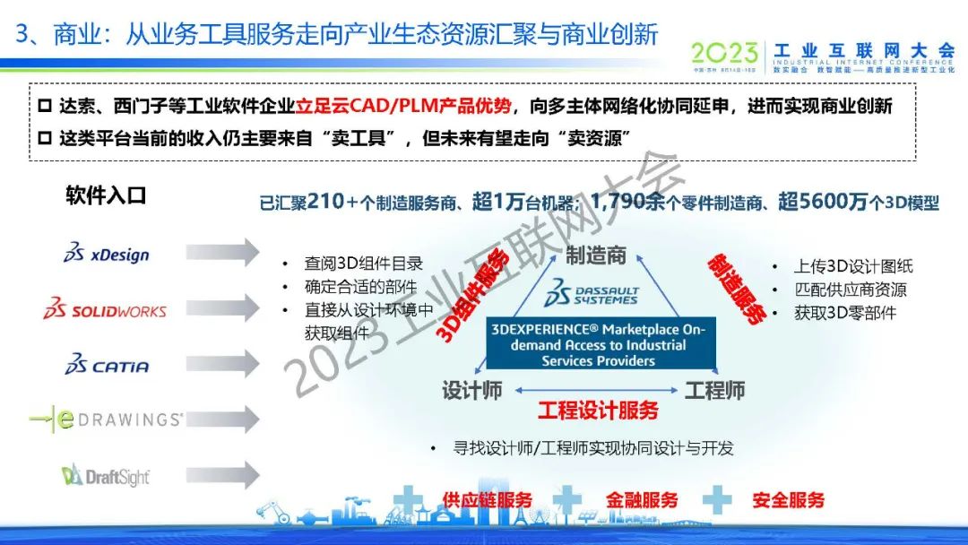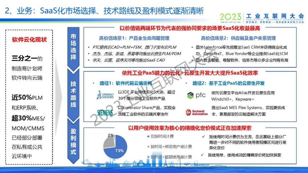 侯羽菲表示,工業(yè)互聯(lián)網(wǎng)平臺技術(shù)以應(yīng)用開發(fā)、智能算法引擎為代表的根技術(shù)能力正在加速升級。業(yè)務(wù)方面,三分之一的制造商計劃將軟件轉(zhuǎn)向云端。近50%PLM和ERP系統(tǒng)、超30%MES/ MOM/CMMS已經(jīng)部分部署在私有或公共云環(huán)境中。而未來應(yīng)充分發(fā)揮我國制造業(yè)龍企業(yè)數(shù)據(jù)、場景優(yōu)勢、電商企業(yè)資源優(yōu)勢,加快補齊、增強、創(chuàng)新我國數(shù)字化服務(wù)商的技術(shù)產(chǎn)品能力,探索形成我國工業(yè)互聯(lián)網(wǎng)平臺發(fā)展的特色路徑。