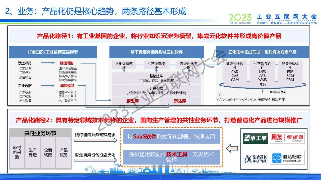 “工業(yè)互聯(lián)網(wǎng)平臺產(chǎn)品化的兩條路徑:一是有工業(yè)基因的企業(yè),將行業(yè)知識沉淀為模型,集成云化軟件并形成高價值產(chǎn)品;二是具有特定領(lǐng)域技術(shù)優(yōu)勢的企業(yè),面向生產(chǎn)管理的共性業(yè)務(wù)環(huán)節(jié),打造普適化產(chǎn)品進行規(guī)模推廣。”