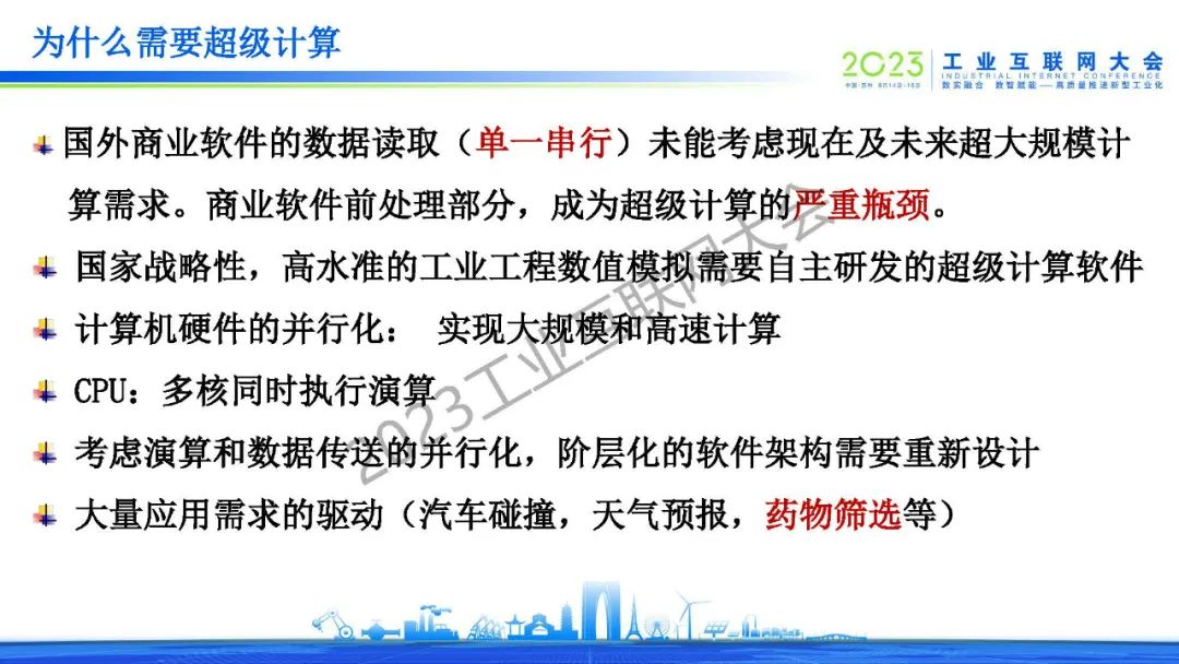 董勤喜指出,超級計算是解決國家經濟建設、社會發展、科學進步、國家安全和國防建設等領域一系列重大挑戰性問題的重要手段。目前主要應用于“高、精、尖”的前沿科學和工程研究。目前,國外商業軟件的數據讀取(單一串行)未能考慮現在及未來超大規模計算需求。商業軟件前處理部分,成為超級計算的嚴重瓶頸。國家戰略性,高水準的工業工程數值模擬需要自主研發的超級計算軟件,實行大規模的高速計算。