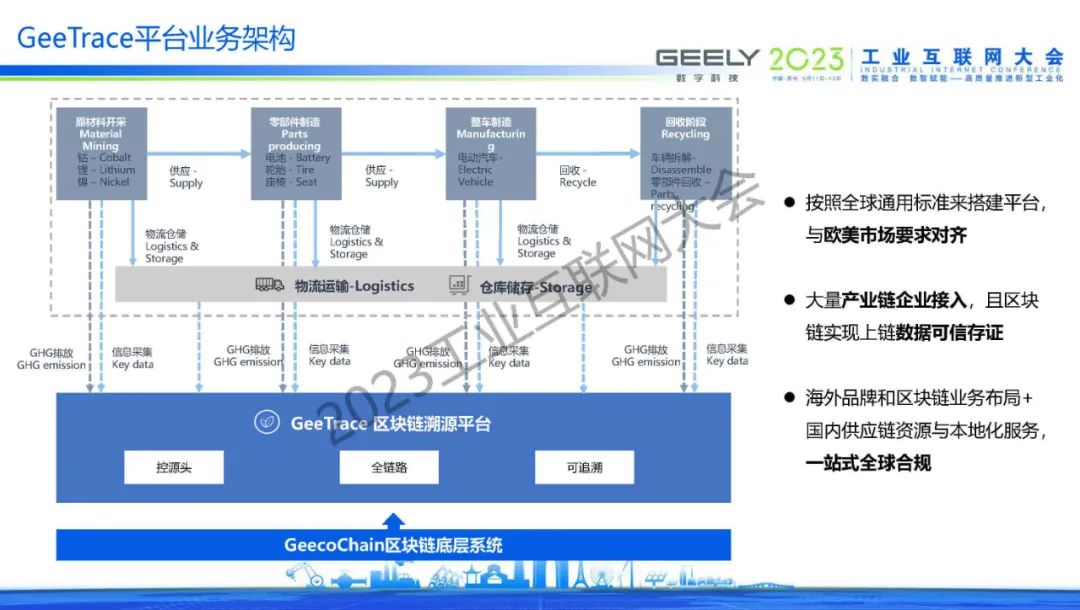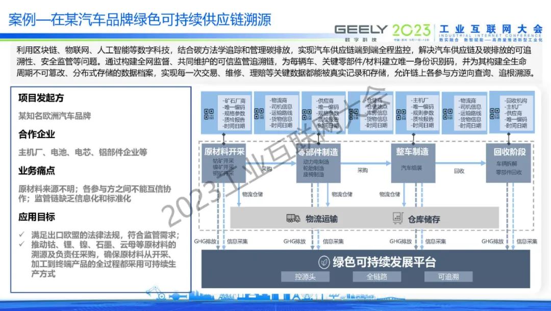“利用區塊鏈、物聯網、人工智能等數字科技,結合碳方法學追蹤和管理碳排放,實現汽車供應鏈端到端全程監控,解決汽車供應鏈及碳排放的可追溯性、安全監管等問題。通過構建全網監督、共同維護的可信監管追溯鏈,為每輛車、關鍵零部件/材料建立唯一身份識別碼,并為其構建全生命周期不可篡改、分布式存儲的數據檔案,實現每一次交易、維修、理賠等關鍵數據都能被真實記錄和存儲,允許鏈上各參與方逆向查詢、追根溯源?!?/p>