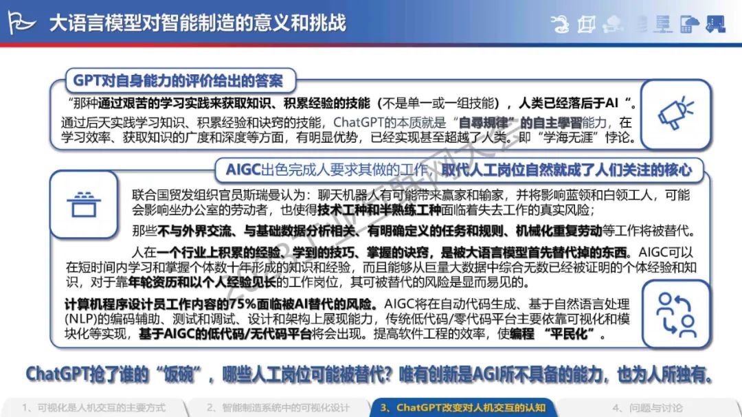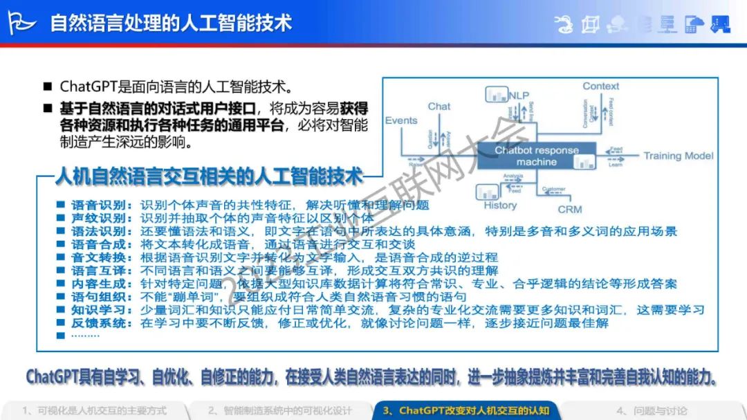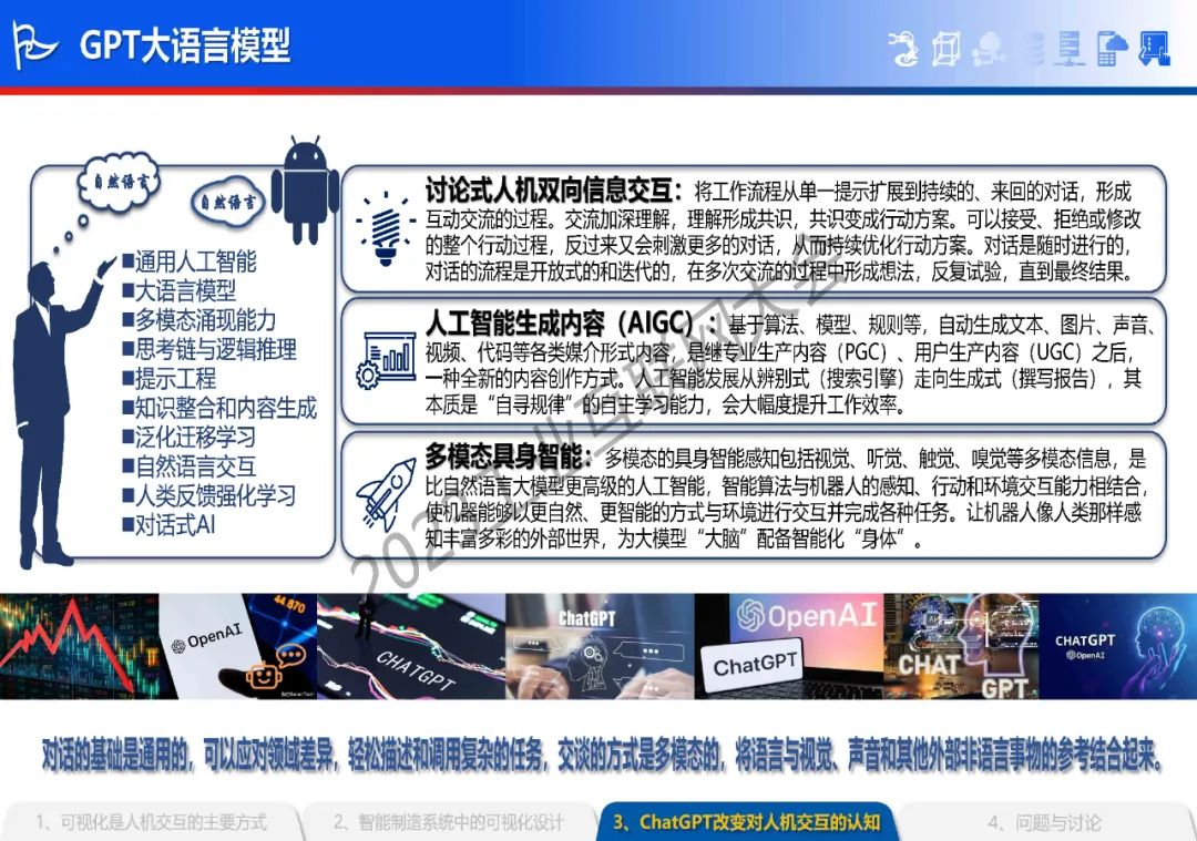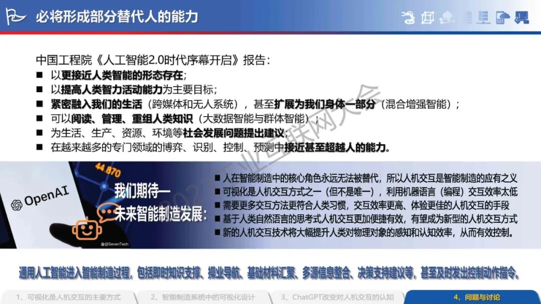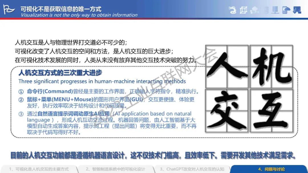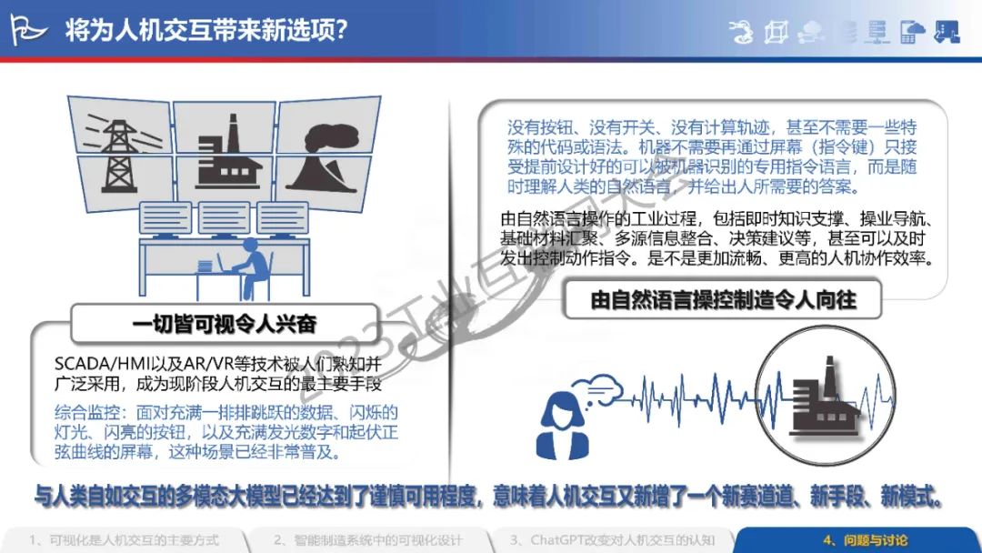 他表示,目前的人機交互功能都是遵循機器語言設(shè)計,這不僅技術(shù)門檻高,且效率低下。需要開發(fā)其他技術(shù)滿足需求。與人類自如交互的多模態(tài)大模型已經(jīng)達到了謹(jǐn)慎可用程度,意味著人機交互又新增了一個新賽道道、新手段、新模式。通用人工智能進入智能制造過程,包括即時知識支撐、操業(yè)導(dǎo)航、基礎(chǔ)材料匯聚、多源信息整合、決策支持建議等,甚至及時發(fā)出控制動作指令。
