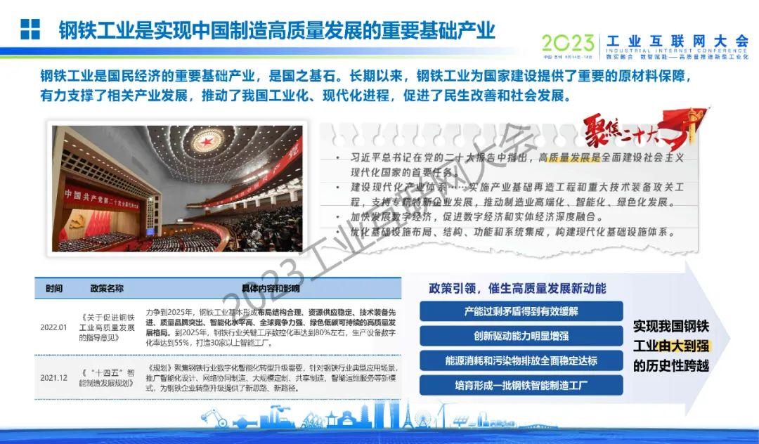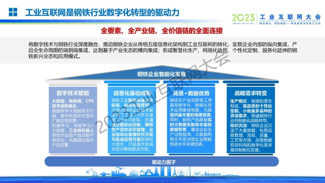 姜濤介紹,鋼鐵工業迎來高端化、智能化、綠色化發展新時代,是國民經濟的重要基礎產業,是國之基石。工業互聯網是鋼鐵行業數字化轉型的驅動力。將數字技術與鋼鐵行業深度融合,推動鋼鐵企業從傳統五級信息化架構到工業互聯網的轉化,實現企業內部的縱向集成,產品全生命周期的端到端集成,達到基于產業生態的橫向集成;形成智慧化生產、網絡化協同、個性化定制、服務化延伸的鋼鐵新興業態和應用模式。