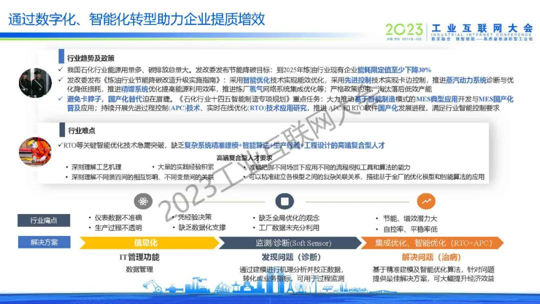王海指出,煉化數(shù)字化轉(zhuǎn)型工作已開(kāi)展得如火如荼,提質(zhì)增效、節(jié)能降碳也是各企業(yè)當(dāng)前的必然需求?;谛畔⒒?、數(shù)字化、智能化、最優(yōu)化的煉化企業(yè)數(shù)字化轉(zhuǎn)型、智能化發(fā)展模式,將迎來(lái)廣泛應(yīng)用。融合機(jī)理和人工智能技術(shù)的智能管控優(yōu)一體化平臺(tái)以MOM+RTO+APC為核心,聚焦生產(chǎn)效益,按需靈活配置,助力企業(yè)數(shù)字化、智能化轉(zhuǎn)型升級(jí)。