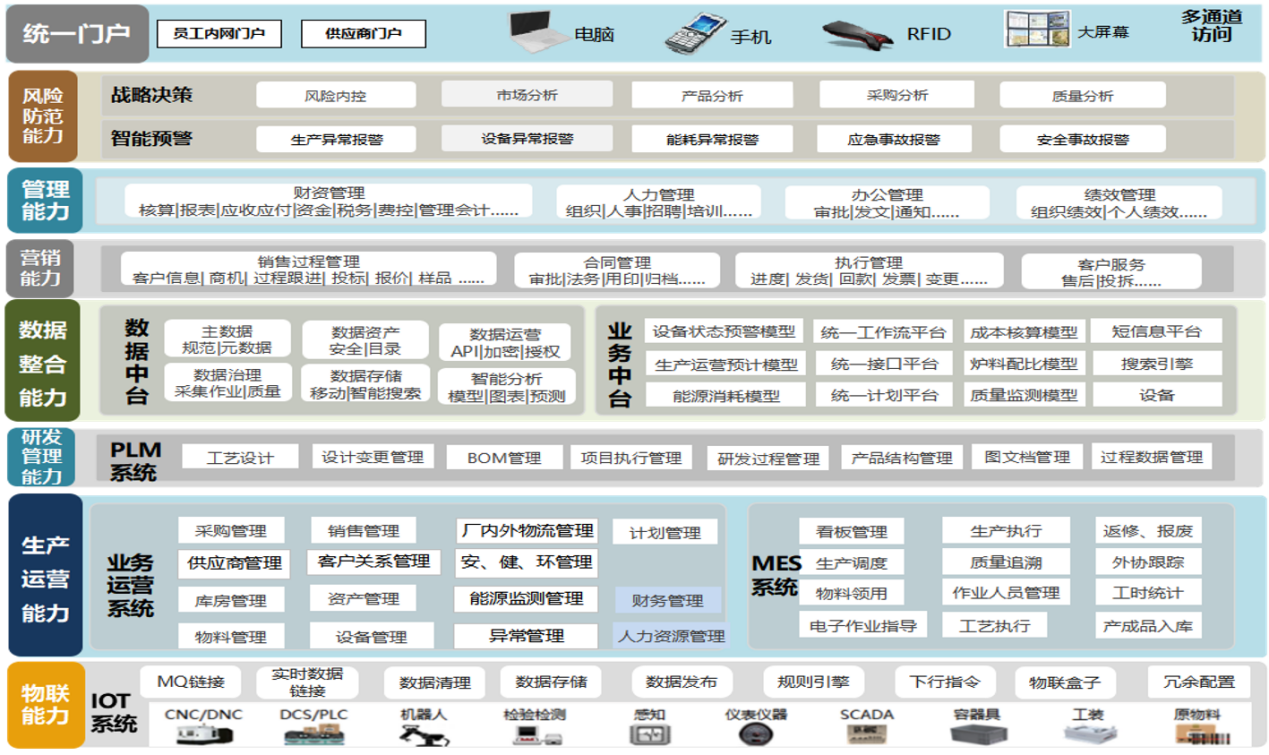 四核心:ERP系統(tǒng)、MES系統(tǒng)、PLM系統(tǒng)、IOT系統(tǒng),完成協(xié)同化管理,智能化分析。