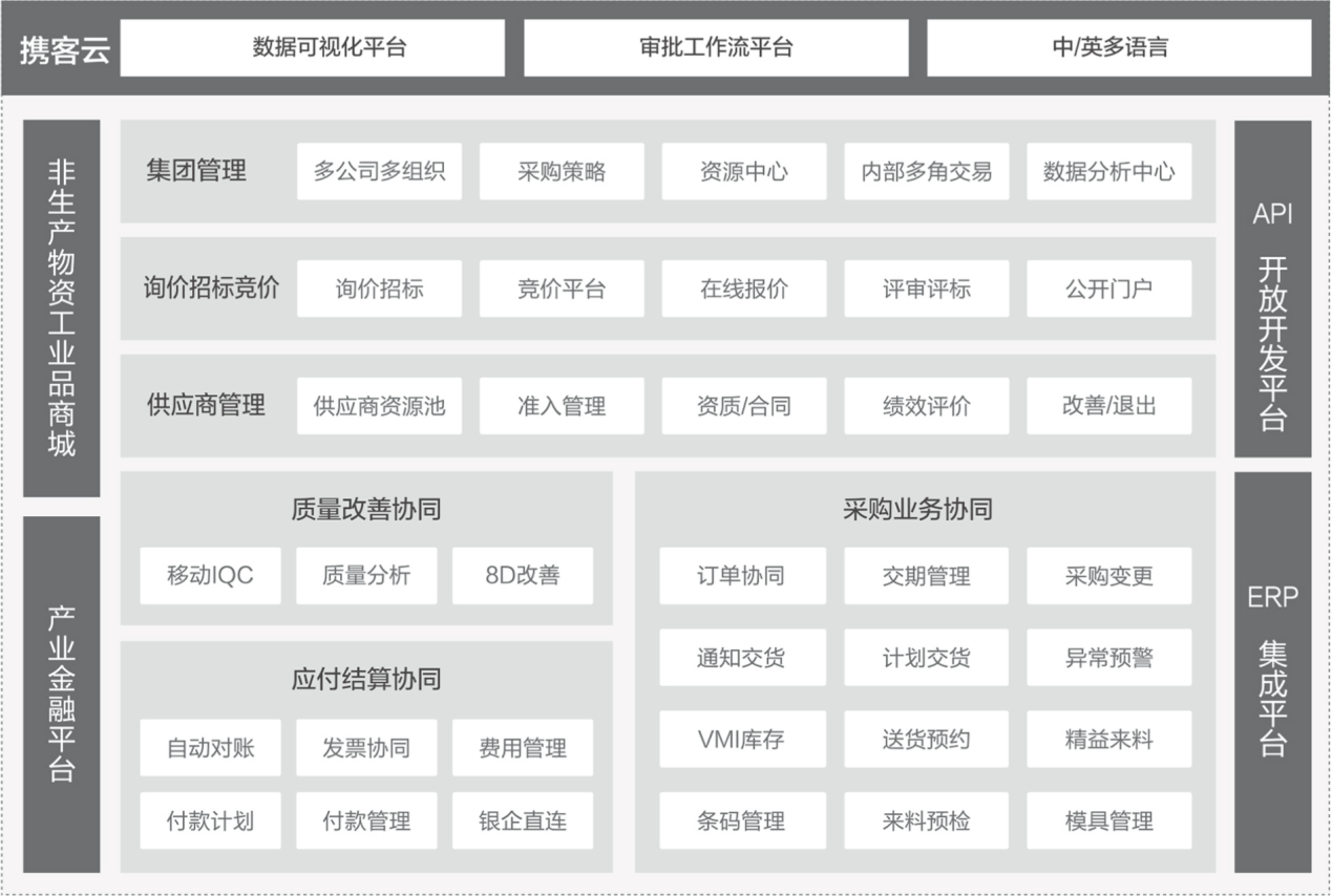 攜客云標(biāo)準(zhǔn)化功能模塊,是上千家制造企業(yè)管理經(jīng)驗(yàn)的產(chǎn)品化平臺,已擁有完備的標(biāo)準(zhǔn)化功能和彈性化的流程,可滿足普遍的制造企業(yè)對于供應(yīng)鏈的管理需求。目前,攜客云已經(jīng)累積近20萬家企業(yè)的供應(yīng)鏈上供應(yīng)商資源,并且自然形成3C、家電、機(jī)械、家具……等多個產(chǎn)業(yè)供應(yīng)鏈資源的聚集,逐漸形成產(chǎn)業(yè)鏈供應(yīng)鏈資源的可復(fù)用化,協(xié)助企業(yè)能夠在需要時,快速、廣泛地對接產(chǎn)業(yè)內(nèi)的其它所需供應(yīng)資源。