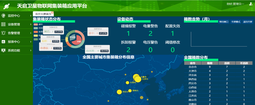 系統為中集集團及客戶提供集裝箱狀態實時監控、歷史狀態查詢、集裝箱貨運合同管理等基本查詢和管理功能。通過衛星終端接入,打造天啟衛星物聯網集裝箱供應鏈管理平臺,可通過多模通信鏈路,兼容多樣化通信數據格式,開放標準數據接口,方便各類用戶開發業務應用。