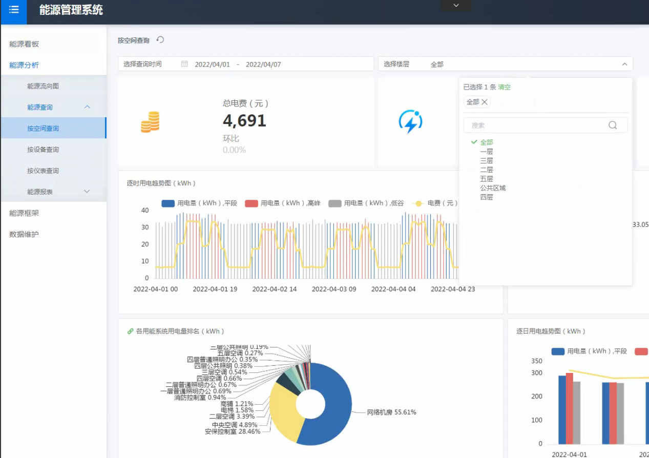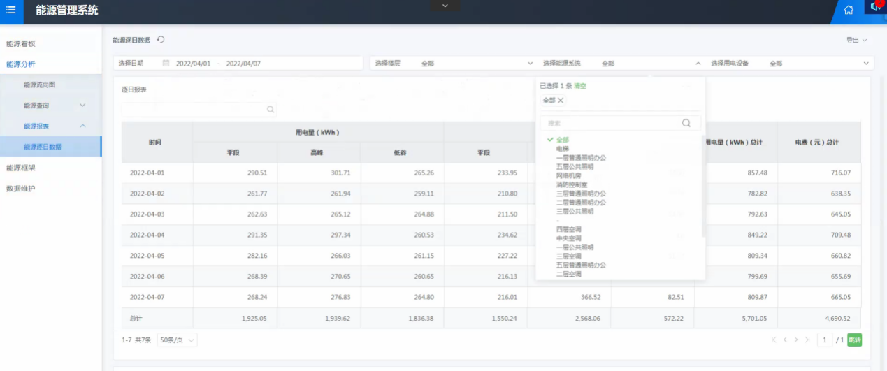 智慧能源管理系統以管理為中心,采集匯總系統的能耗數據,上傳到能源管理中心進行歸納、分析和整理,在整體功能上體現對建筑能源的來源、流向和使用各個環節的監測、統計及分析。