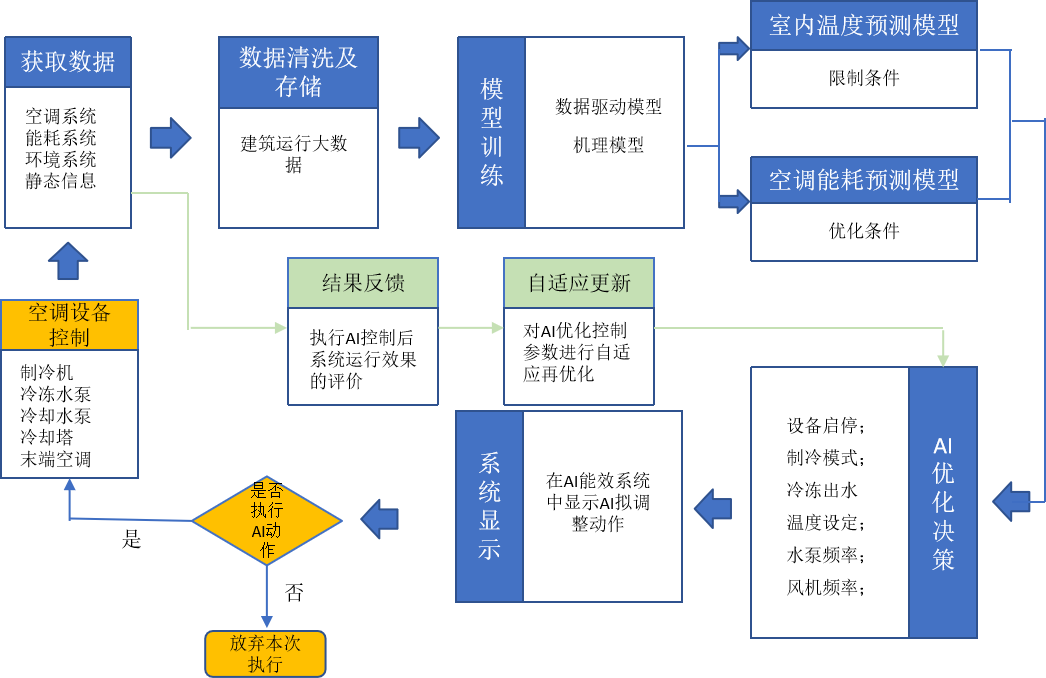 AI優化算法通過能源中心獲取空調系統運行數據、能耗數據以及建筑環境數據,通過對數據清洗、整理及存儲,以數據驅動和系統機理搭建AI優化算法模型,包括溫度預測模型和能耗預測模型,并對空調系統關鍵運行參數進行最優決策,包括主機臺數、出水溫度、水泵頻率、新風機組的風機頻率、風閥開度、水閥開度等,算法將控制指令下發給平臺,實現設備參數的自動調節。