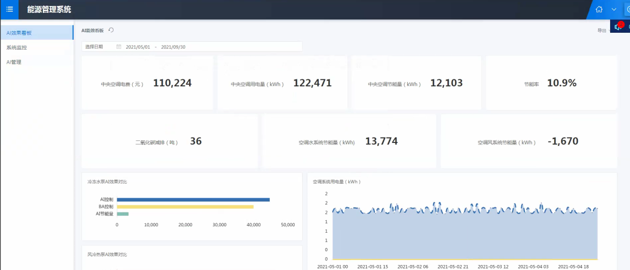在穩定運行的基礎上,通過AI能效系統使設備高效運行。根據實時采集的環境及設備數據對系統進行實時調優,利用數學模型,優化控制中央空調系統的運行模式,提高系統運行效率,延長設備壽命,降低系統維修成本。