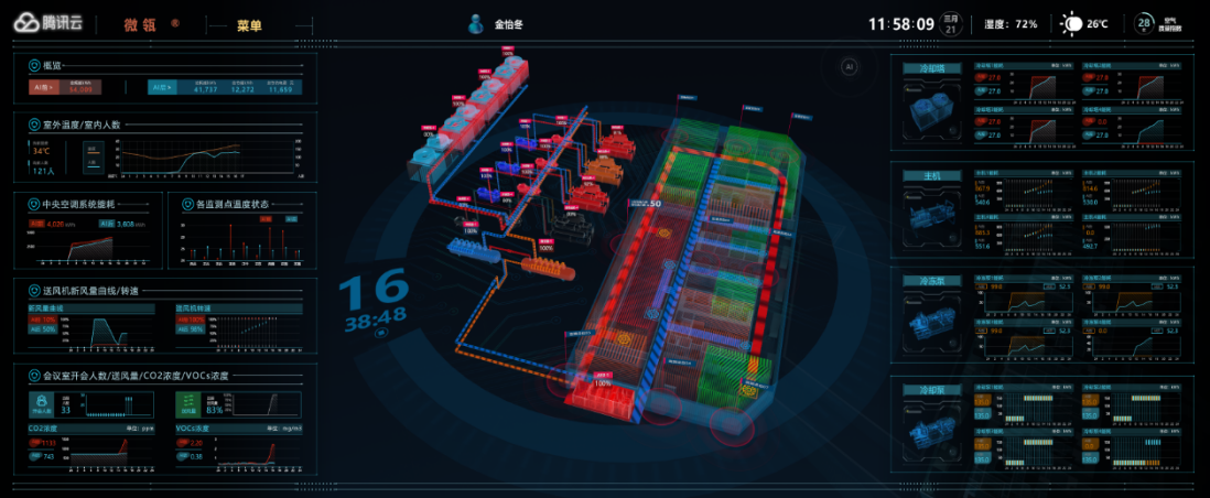 能源中心將利用AI、大數據、物聯網、數字BIM技術,打造安全、便捷、節能的能源綜合利用園區,實現園區整體能源的“可視、可控、可管”。通過整合園區內多種能源系統,如冷熱源、光伏、風機、充電樁、儲能以及其他終端負荷,打造多能互補能源網絡。實現就地生產、就地消納的供應形式,集中式和分布式相協調互補,在微網內實現能源自發自用,甚至余電上網,實現綜合能源轉換效率的提升,清潔能源占比的提升,大幅減少園區碳排放。