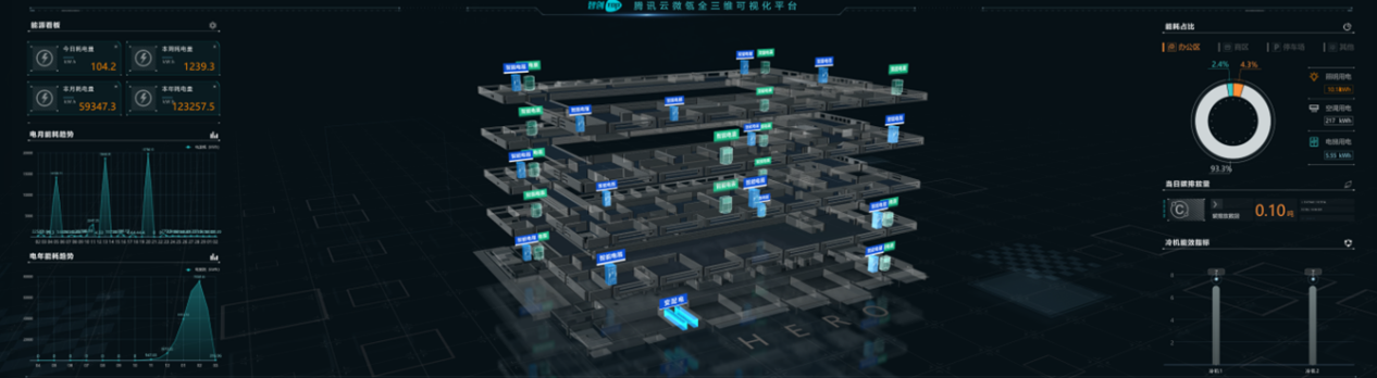 園區運營期間,建筑能源的管理水平以及室內環境的健康舒適是兩項重要指標。本項目基于數字底座打造全域全要素互聯的數實融合新基建體系,通過建設智慧能源管理中心,聯動能耗計量系統、冷源群控系統、風機盤管系統、通風系統等,提供精細的能耗監測、多維度的統計分析、智能的設備控制、可靠的報警管理等服務,一方面利用物聯網技術對建筑能源消耗實行精細化計量,在精細化計量的基礎上,通過多維度分析,實時掌握能源使用動態,從而為能源決策提供有效的數據支撐;另一方面利用大數據智能分析技術,對建筑供冷供熱系統進行優化控制,不僅可以有效提高系統運行效率,減少系統用能成本,還可以有效提升園區 內部各建筑區域的環境空氣質量。通過能源精細化管理、智能優化控制、智能設備設施管理,實現“三理”聯動,助力“雙碳”目標。