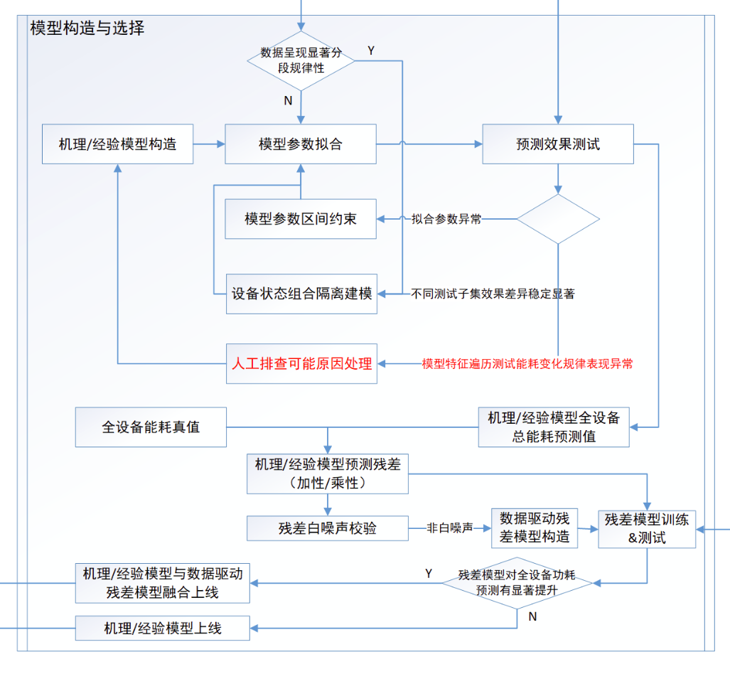 傳統的BA自控系統因存在數據孤島、局部控制等瓶頸,無法利用BA自控系統使得空調系統長期穩定運行在最優水平。本項目構建AI能效智控解決方案,基于園區供水、供電、供氣、供熱等管網系統數據,大數據技術幫助實現三維管線數據、三維地表數據、建筑以及景觀數據、能源設備數據的透視,實現數據驅動的決策支持,并通過能源設備和關鍵節點進行位置、屬性、運行狀態等數據對接,動態采集空間環境實時數據,積累空調系統歷史運行大數據,利用機器學習技術,采用機理能耗預測模型與數據驅動能耗模型相融合的方法,針對各設備分別建立機理預測模型和數據驅動預測模型,選擇預測效果相對更好地預測模型,共同實現能源系統總功率的預測。