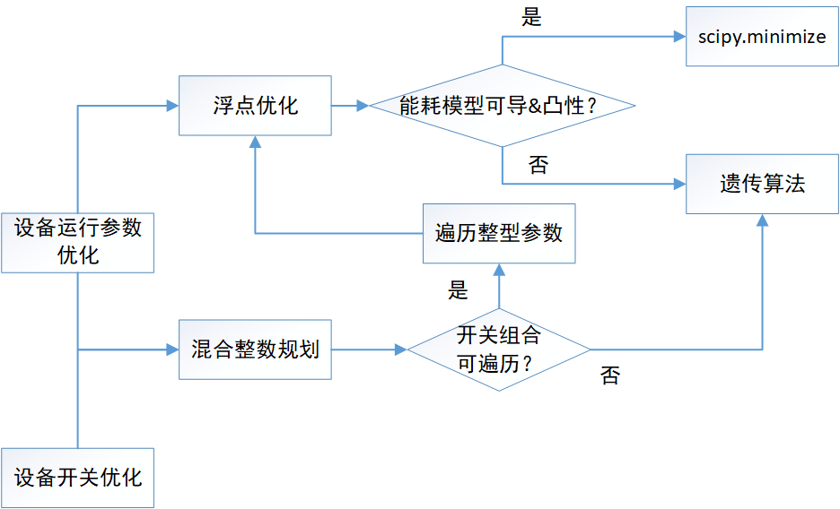 根據歷史數據,采用回歸模型及時序預測模型,提取與能耗相關的特征,采用標準化的特征預處理,以能耗值作為目標列,進行模型擬合,進而實時獲取數據并預處理,其目標是為了在已知負載、環境變量(室外溫濕度等)的前提下,預知各設備處于不同開關狀態組合和不同的控制量設定值時,系統將產生多少能耗,通過能耗預測值對接優化算法;以降低能耗值為目標,在滿足約束條件的基礎上,通過調整各可控變量,使得目標量降低,從而實現節能的目的。