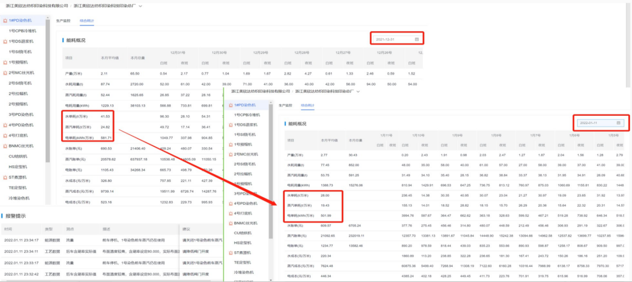 解決方案:美欣達印染產線采用典型的長車染色工藝,設備繁多,工藝復雜,產線長達幾百米,度能系統為給企業提供了基于模型的高級節能分析模塊。深入長車印染產線與工藝,基于能耗數據、生產數據、工藝數據,多維數據建立模型,找到最優能耗,反饋優化參數建議,識別能源偏差與浪費,幫助企業透明化生產管理,及時調優控制,達到精準化節能降碳。